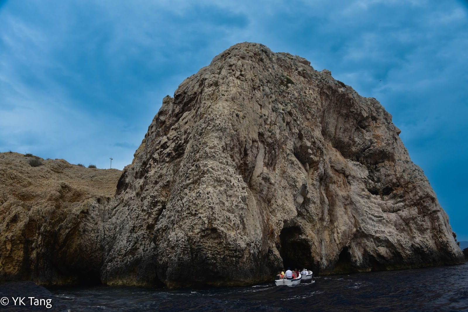 由於此處岩石下端有縫隙,陽光由此折射進去,水面會呈美麗的藍光,所以景色美不美,要看陽光幫不幫忙而定,我們運氣好,藍海水像藍寶石那樣亮光閃動。義大利的卡不里島也有同樣風景,那裡遊客更多。另外,這裡不作興穿救生衣。