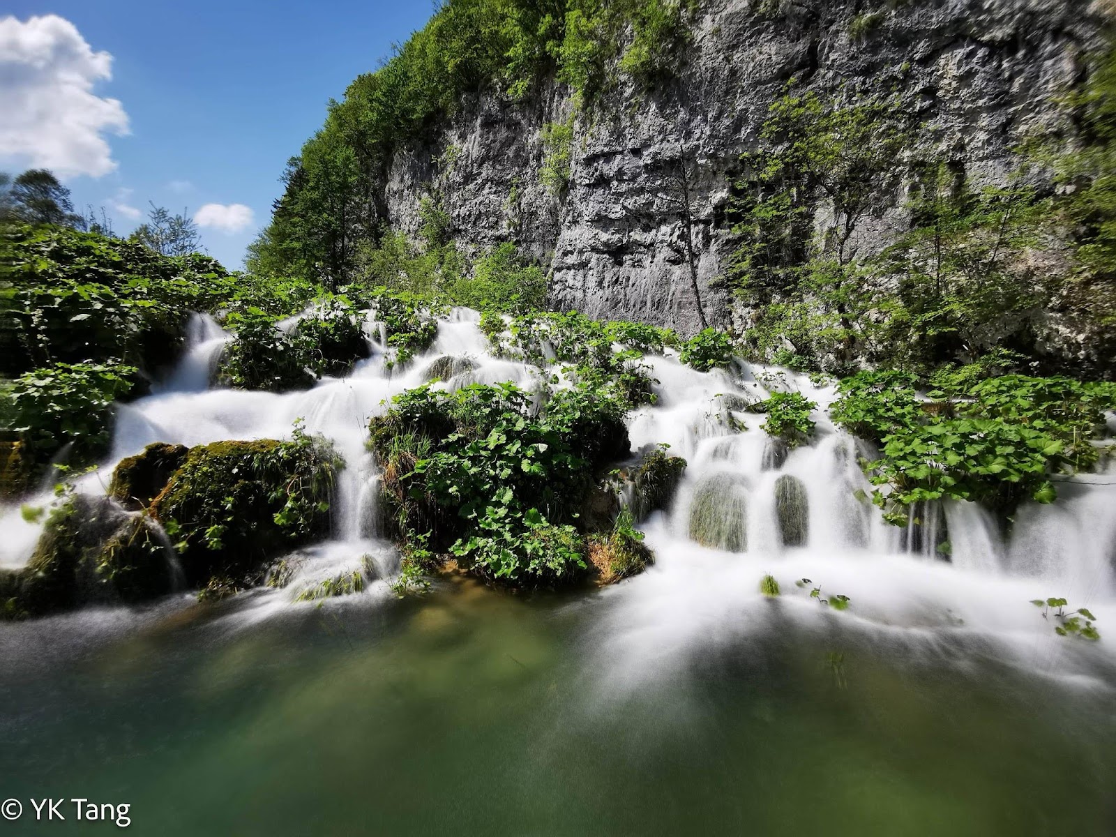 這裡的喀斯特地質,使岩石易於產生縫隙,所以水道, 水孔非常多,沖水時帶來礦物質,使湖底呈漂亮的藍、綠色。用手機照,可得到這種水瀑模糊成白紗的效果。