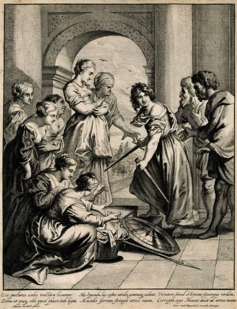 奧德修斯帶來美服和武器,來到王廷,真公主都愛美服, 只有「假公主」阿喀里斯立即抓起武器玩耍, 暴露男兒身。(17世紀荷蘭畫家Rubens版畫)